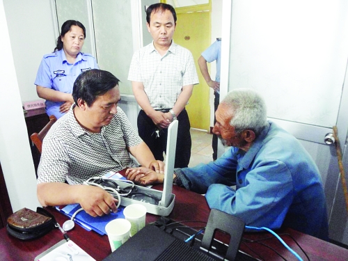 近日,冀州市徐庄乡东午村75岁老人司某到该市司法局法律援助中心咨询赡养事宜,咨询过程中,老人突发高血压等病症,偎坐在地上无法站立。该中心主任刘丽珠见状,立即安排工作人员对其进行照顾,并向局长汇报。局长李秋良到镇医院将医生接到司法局为老人诊断。随后,又派人为老人买回药品。待老人的情况有所好转,派人将老人送回了家。图为医生正在为老人诊治。