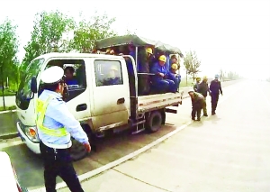 10月4日上午7时15分,鹿泉市交警大队民警在巡逻中,发现一辆中型货车上挤满了人,民警立即将该车拦停。经查,该车核定载客5人,实载40人,车厢内挤了8个人,8平方米的车斗上令人匪夷所思地站了32个人。民警对该车司机和乘车人员进行严厉批评教育后,对该车司机依法进行了顶格处罚。张庚鑫 摄