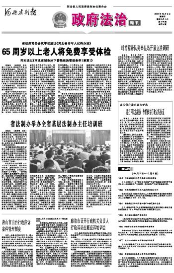 通知指出,《河北法治报·政府法治周刊》是省法治办与河北法治报社合办的全省唯一一家集权威性、指导性、知识性和可读性为一体的周刊。每周四出版,是宣传各级政府行政执法的重要阵地,主要刊登省委、省政府有关推进依法行政、建设法治政府的重大部署、工作安排和依法行政的动态消息,集中报道各地各部门推进依法行政的重大举措、取得的经验和成效,披露存在的问题,刊发专家访谈、法律咨询、案例分析等对依法行政工作进行深度宣传报道。《河北法治报·政府法治周刊》创刊近八年来,深受全省政府法治部门和广大工作者的信赖,已成为我省依法行政宣传工作的重要载体,和各级政府法治部门交流工作的重要平台和指导工作的重要渠道。同时更是政府法治工作的一个窗口,要更多的利用这个窗口宣传依法行政工作。