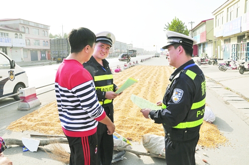 秋收后,许多农户将收获的玉米、大豆等堆放在公路上晾晒,给道路安全造成了很大隐患。邯郸交警五大队组织民警深入辖区国、省道及城乡接合部周边道路,开展占道晒粮清理整治。民警向晒粮农户详细讲解占道晒粮给过往车辆及自身安全带来的危害,劝导农户不要在公路上晒粮,共同维护良好的道路交通秩序。