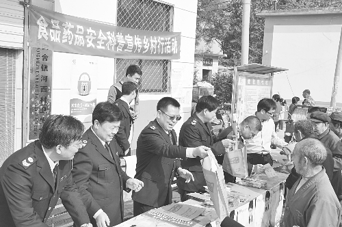 10月26日,由石家庄市食品药品监督管理局主办,石家庄演艺集团承办的石家庄市“食药安全科普宣传乡村行”活动在石家庄市平山县河西村新文化广场举行。此次活动是石市食药监局创新食药安全科普宣传形式的一次尝试。图为该局工作人员现场接受群众咨询。 本报记者 刘东昕 摄