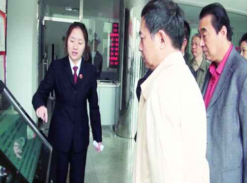 保定市南市区检察院为进一步接受社会监督,深化检务公开,日前邀请部分人大代表、政协委员等各界人士走进检察院,就推进检务公开工作进行座谈。图为该院检察人员向受邀代表介绍本院检务公开建设成果,演示电子查询屏使用方法。 王海琼 居志强 摄