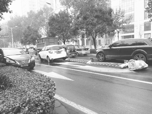 11月24日7时许,在省会红旗大街与建国路交口路段,一辆由北向南行驶的白色轿车将马路中心的隔离墩撞翻后,又撞倒五六米护栏,最终逆行驶上对向车道。此路段附近有学校,早晨正是送孩子上学的时间,交叉路口随时有行人或非机动车通过,本报奉劝广大司机朋友开车一定要谨慎慢行,遇有路口等复杂路段一定提前观察,注意避让。 本报记者 张世杰 摄