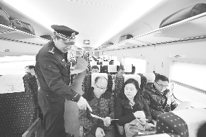 ⑤ 12月2日上午,北京铁路公安局石家庄公安处乘警支队民警白数平在列车上对旅客进行宪法知识宣传。 孙凯强 摄