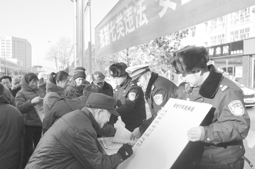 万全县公安局日前在县城繁华地段开展了以“抵制七类违法、安全文明出行”为主题的交通安全宣传活动,民警通过发放宣传材料、摆放宣传展板、现场法律咨询、驾驶员“安全行车我承诺”签名等形式,进一步增强了广大交通参与者的交通安全意识和文明行车的道德意识。 刘斌 摄