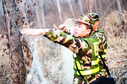 为保护候鸟越冬,唐山市公安边防支队近日组织开展“清网行动”,打击非法捕捉、收购、出售候鸟等破坏野生动物的违法犯罪行为,全力保护沿海地区野生动物生态环境。行动当天,边防民警清理捕鸟网具17张,并将缴获的64只野生候鸟放归自然。此次护鸟清网专项行动将持续到2月底。图为边防派出所民警正在林场清理盗猎者非法架设的捕鸟网具。