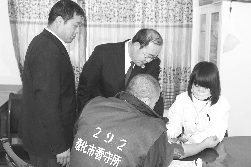 遵化市人民检察院监所检察科和控申科干警加强对在押人员健康状况的监督检查,保障在押人员的合法权益。图为2014年12月31日,该院驻监所检察室和控申科干警正在了解医生对在押人员的查体情况。 李长生 摄