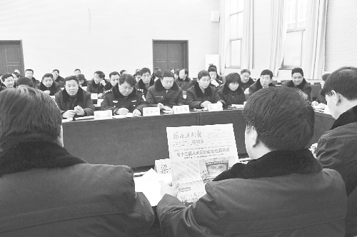 1月14日下午,行唐县人民法院组织全体干警,以汇报座谈的形式,认真学习河北省十二届人大三次会议精神,汇报总结2014工作,谋划2015年工作。图为会议现场。