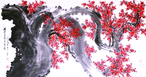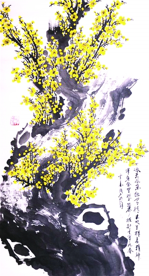 先生的画,总体感觉色彩明烈而大胆,气韵生动而直率,简朴而不失精致,浓艳而不失凝重感。尤其那满纸铺张、梅的躯干,苍劲古朴、潜伏着一种勃勃生机,梅的铁气、傲气、雪中得天气质,跃然纸上,与人形成强烈的对话语言:不惧江天万里霜。难怪著名漫画家方成题词:铁骨冰情一绝梅。全国政协原常委、著名书法家夏家骏题词:中国梅花第一家。