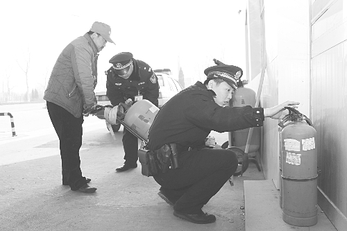 固安县公安局精心组织、周密部署、全警动员,确保各项安保措施落到实处。图为3月9日该局城东派出所民警正对辖区加油站的消防设施进行检查。