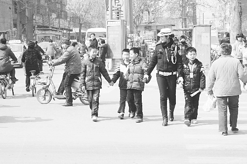 几年来,邯郸市交警支队六大队女子中队始终坚持开展“护学天使”活动,每日上下学都有女民警轮流来到校园周边主要路口进行护校,风雨无阻。图为该中队民警在护送学生过马路。