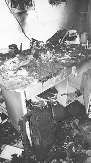 3月19日上午,记者在李老太太的房间看到,房顶、墙壁、地面、床铺上全是一层黑色的粉末,一旦粘在手上很难清洗干净。桌子上面有一堆黑乎乎的碎片,还有掉在下面严重变形的铁框,很难想象这些物件曾是一台电视机。