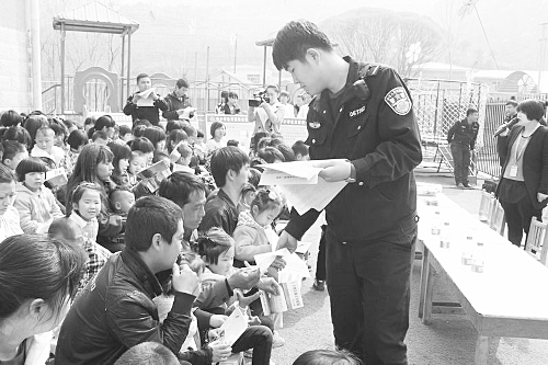 为进一步加强幼儿交通安全知识教育,提高幼儿及家长的遵规守法意识,4月9日,宽城交警大队民警走进孛罗台镇育红幼儿园,为孩子和幼儿家长上了一堂主题为“关爱生命、文明出行”的交通安全课。图为民警向幼儿家长和孩子发放宣传材料。