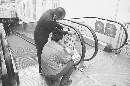 为提高市民安全乘坐电梯的意识, 4月23日,迁安市质监局为全市1522台在用电梯免费发放了《电梯安全提示标志》,确保市民文明、安全乘坐电梯。图为该局工作人员在粘贴《电梯安全提示标志》 。