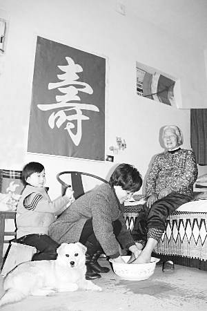 上图,98岁的张富荣老太太,在艰苦的环境里把7个女儿培养成人。目前她已是五世同堂,膝下有132口人。这不,孩子们来了给她洗脚,小重孙女看着她妈妈给太姥姥洗脚,也主动跑上去给妈妈捶背,爱在这个家里得到了传承。