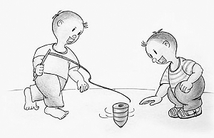 大功告成,便可以玩耍了。将鞭子绕着陀螺用力一拉,陀螺便顺势落到地面,并极速地转动起来,令人眼花缭乱,然后只需不时地抽打几下,随着“啪”“啪”的脆响,陀螺便会不知疲倦地转动下去。