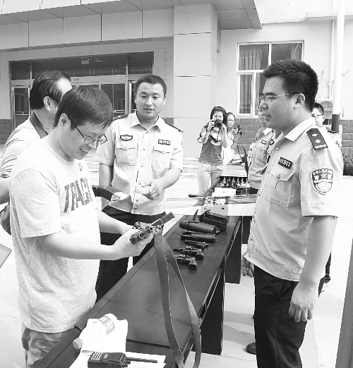 6月17日,衡水市公安局经济开发区分局组织召开执法公开新闻发布会。来自中央、省级、市级的10余家主流新闻媒体及50余名群众代表应邀参加新闻发布会。会后,媒体记者及群众代表参观了分局集中服务办事大厅、办案中心、指挥中心,并现场观摩了巡特警大队的实战演练。图为民警展示警用枪械。