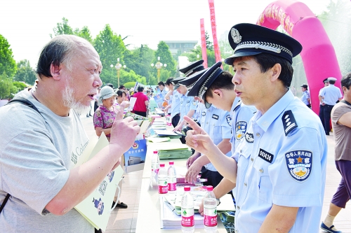 6月18日,省公安厅与石家庄市公安局在省会西清公园共同开展了“执法为民宣传日”活动,治安、刑侦、网安、法治、出入境、禁毒、经侦、食药、环安、交管、消防、边防等警种部门参加活动,现场摆放宣传展板70余幅、发放宣传画册和宣传品2万余份,为群众讲解法律知识、接受群众咨询300余次。图为民警正在为群众解答咨询。