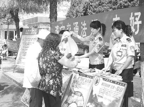 为有效预防道路交通事故的发生,暑期到来之际,高碑店市公安局交通警察大队组织宣传民警小分队,深入市区重点街道、中小学校、幼儿园,设立多处宣传站,开展以“遵守交通法规、走好生命路”为主题的宣传活动。图为民警向群众发放宣传资料。