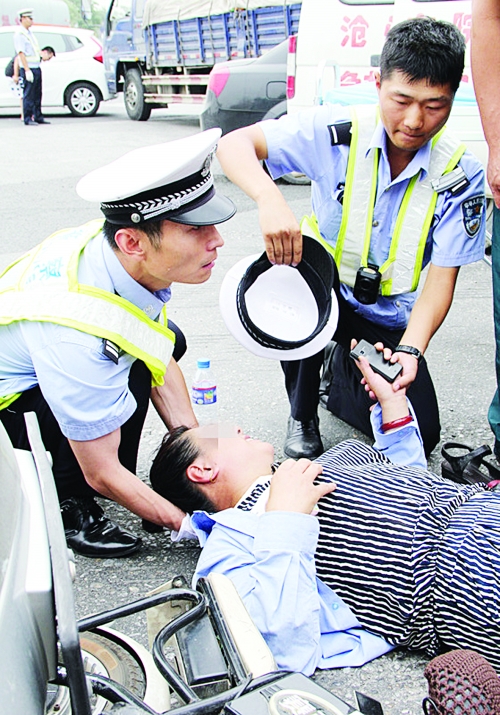 7月15日10时10分许,沧州市区一辆出租车和一辆电动车发生交通事故,电动车驾驶人腿部受伤躺在地上。市公安交警二大队执勤民警见状后迅速到事故现场,指挥车辆分流,查看驾驶人伤情,立即将事故情况报告事故中队,并联系120救护车对伤者进行救治。两民警一人用手托住伤者的头部,一人用帽子为伤者扇风降温,减少伤者痛苦。过往群众见此情景,纷纷为民警竖起拇指。
