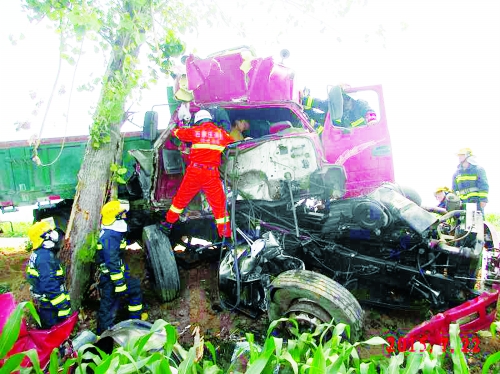7月22日9时55分许,石家庄市公安消防支队无极中队接到报警:无极县高头乡谈下村发生车祸,一辆卡车冲入公路一侧沟中,驾驶室内有人员被困。救援官兵到达现场后发现,侧翻到路沟里的卡车整体严重变形,汽车零部件和玻璃碎片撒落一地,被困人员身体疼痛,无法动弹。救援人员一边观察被困者情况,进行心理安抚,一边利用破拆工具破拆变形的车门。经过消防官兵十多分钟的紧张救援,被困者被成功救出。图为消防官兵正在紧张救援。