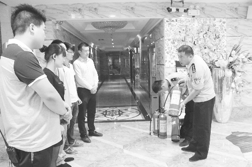 近日,香河县公安局新开街道派出所组织社区民警对辖区娱乐场所工作人员进行了消防知识培训和疏散逃生演练,增强了工作人员自救和扑救初起火灾事故的能力。图为民警在讲解灭火器的使用方法。