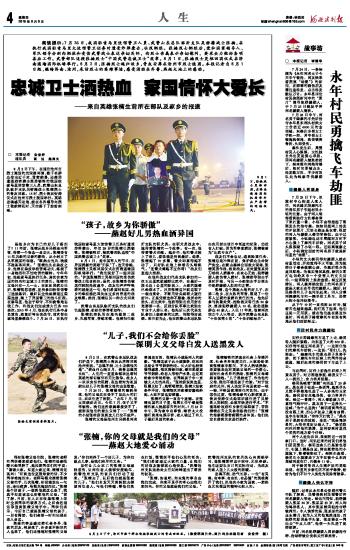 7月26日,张楠罹难的噩耗传来,他的父母实在受不了如此大的打击,双双住进了医院。“去年7月,侄女因癌症去世。今年7月,侄子又不幸牺牲。我们这些亲属都接受不了,就别说他们的亲生父母了……”张楠的小姑张桂彦说到这儿已泣不成声。