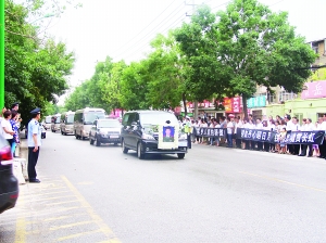 8月2日下午,在通往沧州市烈士陵园的光荣路两侧,数千名群众排出近千米,冒着酷暑,迎接因遭遇恐怖袭击英勇牺牲的我国驻索马里使馆警卫人员、武警山东总队临沂支队吴桥籍战士张楠烈士的骨灰回家。15时,烈士骨灰安葬仪式在沧州市烈士陵园举行。英雄忠魂感天动地,就在各界领导向烈士敬献鲜花时,天空落下了纷纷细雨。