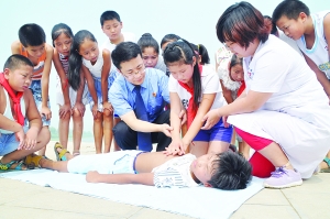 8月9日,永年县检察院在广府镇环河水边开展“珍爱生命 预防溺水”未成年人权益保护安全教育活动,检察官通过实例警示教育、在危险区域设置警戒牌、现场模拟急救等形式,向孩子们传授防溺水的知识和技能,以此提高他们的安全防范意识和自我保护能力。图为检察官和医务人员正在向孩子们讲解急救常识。