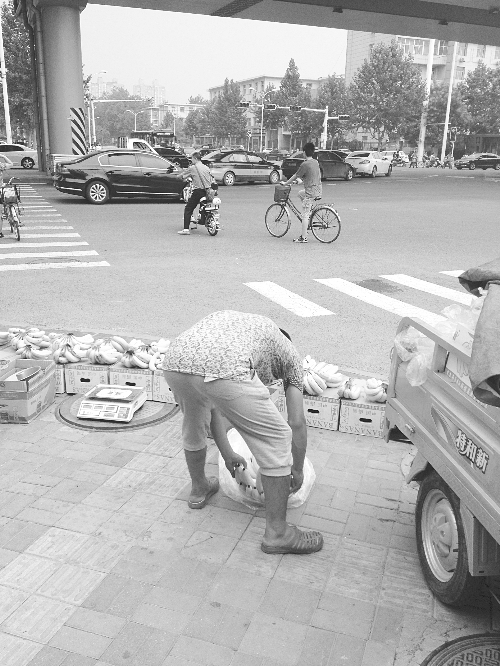 8月7日11时30分左右,记者经过省会槐安路与红旗大街交口西南角时,发现一名小贩竟然在这里卖起了香蕉。摊点正好位于红绿灯下,时不时有路过的行人和骑车人停下来询问价格并购买,给道路交通带来极大的安全隐患。图为小贩从袋子中拿出香蕉摆到路旁。
