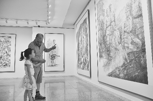 8月15日上午,由省委宣传部、省文化厅主办的“纪念抗日战争胜利暨世界反法西斯战争胜利70周年”美术作品展览在省美术馆拉开帷幕。此次美术作品展是该馆在3月组织全省80余位画家走入太行革命老区,有针对性地体验生活、搜集创作素材,创造出的国画、油画、版画、雕塑四类作品,高度还原了抗日战争时期的革命历史画面。图为市民在观赏抗战美术作品。