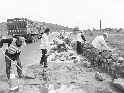 万全县交通运输局公路管理站加大山区公路养护管理力度。针对207国道半坝路段坡陡、弯多、沟深的情况,该站在危险路段增设安全防护设施长城垛、钢筋混凝土护栏、波形钢护栏,大大提高了公路综合服务能力,确保了下坝车辆的行驶安全。图为该站工程技术人员正在公路弯道上砌安全防护设施长城垛。