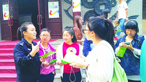 河北省第二届“网络安全日”活动期间,石家庄市公安局组织民警在北国商城广场和石家庄经济学院设立《安全用网 守法前行》为主题的网络安全宣讲台和咨询台,发放宣传海报和宣传册,向广大网民普及网络安全知识。图为10月17日上午,在石家庄经济学院,民警向学生们宣讲网络安全注意事项。