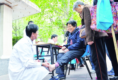 10月21日是农历九月初九重阳节,记者一早来到石家庄市人民广场,看到广场上聚集了许多晨练、赏秋赏菊的老年人。不少志愿团体特意前来为老年人提供志愿服务,弘扬尊老、敬老、助老的良好社会风尚。图为医务人员在为老人们义诊。