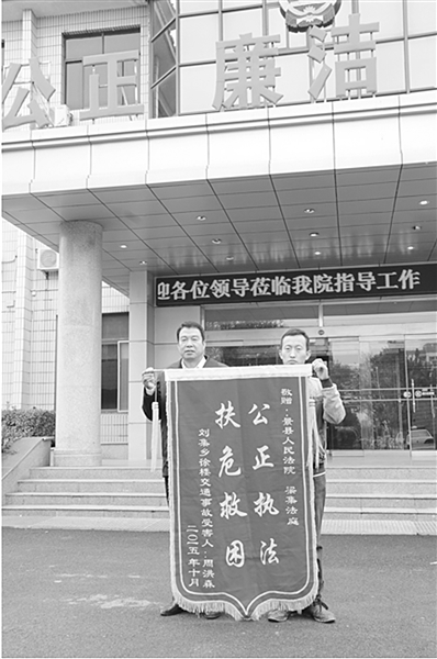 11月3日上午,景县刘集乡徐楼村村民周影(周洪森之子)怀着感激之情将写有“公正执法 扶危救困”的锦旗送到景县人民法院党组副书记张庆忠手中,他激动地说:“我父亲被撞伤的事情终于得到了解决,今天专程送锦旗表达我们全家对梁集法庭庭长李凤志法官的感激之情,感谢李法官公正审判主持正义!”