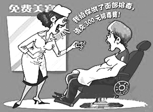 有一天,正在街边闲逛的王小姐被热情的李明拦下来,李明告诉王小姐,因为新店刚开张,可以免费做面膜并且送一些产品,心动的王小姐走进了“包你美”美容美发店。王红和朱莉给王小姐涂上了面膜膏进行面部按摩,在按摩的时候王红对王小姐说:“美女,你的皮肤有些粗糙,最好做一个仪器检测。”因为进来的时候,一直强调是免费体验,所以王小姐也就答应了。王红一边检测一边对王小姐说道:“美女,如果仪器检测之后,脸上出现黑色的物质就要收700元检测费的。”王小姐自信自己的皮肤保养比较好,也就答应了。可“检测”完后,王小姐在镜中看到自己的脸变得面目全非,全是黑色的不明物。王小姐立刻要求清洗面部,但王红说:“这是清水洗不掉的,如果清洗不及时会深入到毛孔里,永远洗不掉的,必须用我们的专门的精油药水才可以清洁,不然脸部会红肿溃烂。”说完便让朱莉拿来一张清洗价目表,王小姐看了一眼价目表后表示自己受到了二次惊吓,洗一次脸要3000元!朱莉看到王小姐的反应后,立刻说道:“3000元只能洗一次不划算,5000元套餐的话可以进行10次深度面部清洁,6000元的套餐可以做20次清洁,还送10次按摩减肥疗程。”