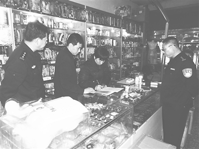 为把好药品和食品安全关,秦皇岛经济技术开发区公安分局食品药品安全保卫大队不定时对辖区药店、保健品店开展突击检查,同时把有关安全常识、法律法规宣传到每一个销售店。图为民警对辖区内经营药品和食品的店铺进行检查。 本报记者 桑桂林 摄