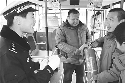 1月20日,石家庄市鹿泉区交警大队安排中队民警来到途经鹿泉的311路和317路公交车站开展交通安全大检查。民警向公交车驾驶员发放了春运交通安全宣传手册,并对每辆公交车的车载灭火器、逃生锤等进行了详细检查登记,对存在的问题和安全隐患要求公交公司负责人立即整改到位。图为民警对公交车上的车载灭火器进行检查。 张庚鑫 摄