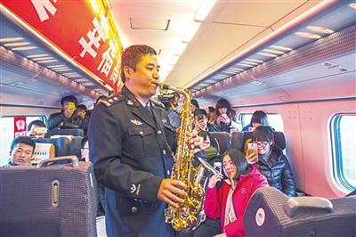 活动中,石家庄和天津的铁路民警们为旅客送上独唱、快板、萨克斯演奏、相声及京剧等节目,尽情倾诉着首都铁警真诚为民服务的心声,一曲曲的歌声、萨克斯勾起了人们对家人的思念;一段段诙谐幽默的快板、相声及京剧减轻了旅客乘车的疲惫。