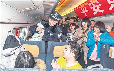 1月24日,2016年春运正式拉开帷幕。石家庄铁路警方充分发挥区域优势,服务京津冀出行旅客,联合天津铁路警方,围绕“平安京津冀,幸福高铁行”的宣传主题,在新开通的津保高铁动车组D6724次列车上开展了新年送祝福爱民安全宣传实践活动,为广大旅客送上了温暖和祝福。
