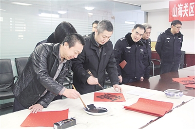 1月15日至1月28日,秦皇岛市山海关公安分局与山海关书法家协会联合举办 “迎新春、写春联、送祝福”联谊活动。民警们与书法家们一起挥毫泼墨,用一幅幅主题突出、意境深远的作品,抒发公安民警顽强拼搏、共担使命的壮志豪情。 本报记者 桑桂林 摄