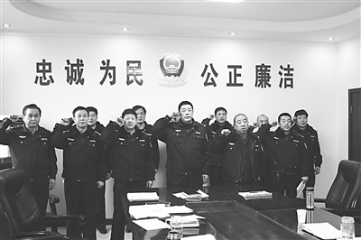 高邑公安局党委班子成员在局长胡玉兵的领誓下面对党旗宣誓