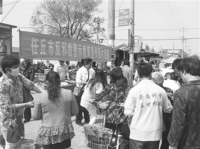 图②任丘市把反邪教警示教育巡回展搬到了农村大集,赶集的众乡亲纷纷前来领取反邪教宣传资料。