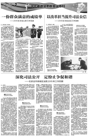 2015年,全省公安机关深化改革,忠诚履职,圆满完成了各项安保维稳任务,破获涉枪涉爆、食品药品、网上违法案件分别上升130%、21%、5%,“猎狐”缉捕率上升到58%,“两抢”案件、群体性事件、交通、火灾事故分别下降24%、23%、21%和22%;资源整合、阳光警务等建设创出了河北经验,执法机制、警辅管理、户籍制度等改革走在了全国前列。群众满意度上升到98%。