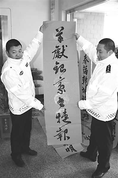 “这幅大的我要贴在院门上,您再给我写幅小的,贴在屋门上。”面对着基层民警们的需求,艺术家们有求必应。“您给我写一幅不带‘猴’的,明年还能接着用。”看得出来 ,大家对于艺术品的珍惜。