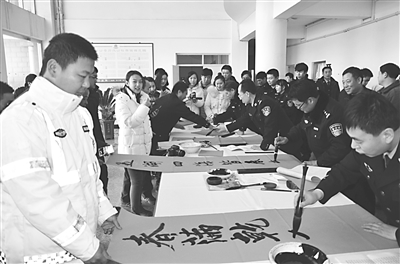 在活动现场,省公安厅党委委员、政治部主任史贵中亲切看望了献艺的警营书画艺术家,勉励大家发挥水平、写出精品。“新春送福”活动一直持续到天色将晚,人们都高高兴兴地拿到了称心的春联和书法作品。省公安厅政治部副主任、宣传处处长贾永华表示,这样的活动,省公安厅今后还将继续坚持下去,以优秀的公安文化作品暖警心、励斗志,进一步推进公安工作全面开展。