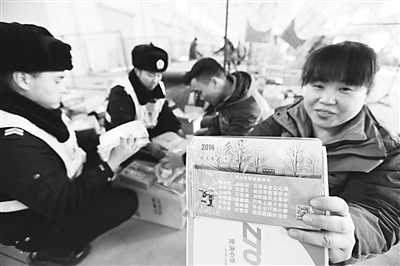 为做好春节前交通安全宣传工作,邢台交警高开区大队创新宣传方式,与中通快递合作,将3000多份交通安全资料捆绑在包裹上,通过快递将交通安全精准投放。图为快递工作人员和交警正在向包裹上粘贴交通安全资料。 杨国良 摄