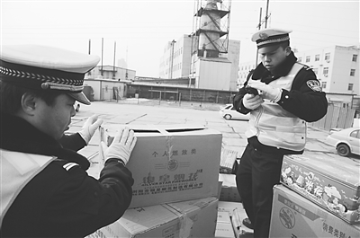 1月28日10时许,沧州市交警支队二大队九中队执勤民警在对一辆单排货车进行检查时,发现该车拉了40多箱烟花爆竹。民警对车主讲解了非法运输易燃易爆物品的严重性并依法将车辆暂扣,按照相关规定对驾驶人进行处理。 孙明山 摄