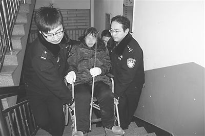②一位服刑人员的母亲身有残疾,还是坚持来看望儿子参加帮教,监狱干警把老人抬到三楼帮教会现场。