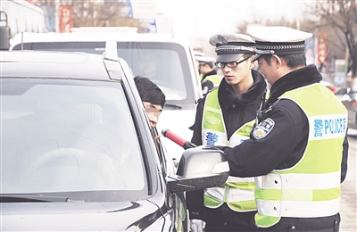 春节期间,沧州市公安交警二大队在保障市民平安出行的同时,利用早中晚时间段,开展了酒后驾驶集中整治统一行动,依法严查酒驾、醉驾等严重交通违法行为。图为2月13日下午2时30分,执勤民警在市区解放路对机动车驾驶人进行酒精测试。